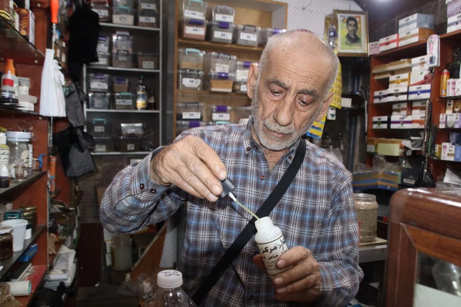 Lebanese herbalist Akl Khalaf gets a customer at his pharmacy in Lebanon’s japanese town of al-Bireh on April 25, 2022. (Photograph by Taher Abou Hamdan/Xinhua)