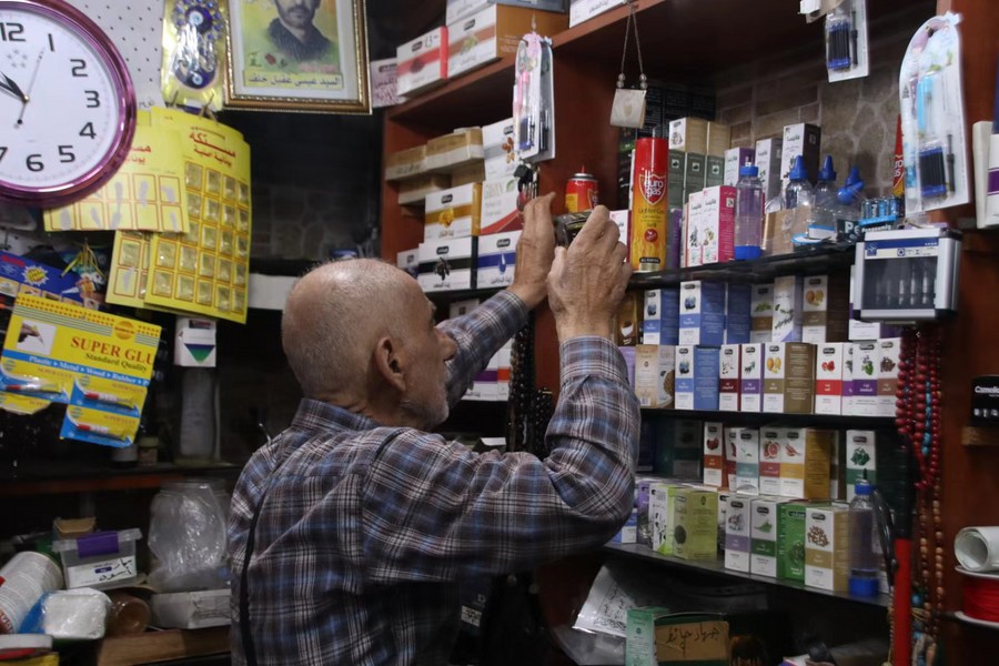 Akl Khalaf arranges organic medications at his pharmacy in Lebanon’s southern town of al-Bireh on April 25, 2022. (Image by Taher Abou Hamdan/Xinhua)■